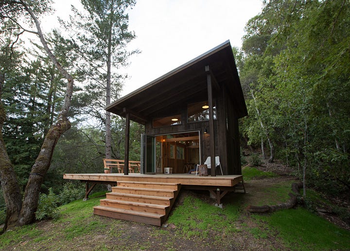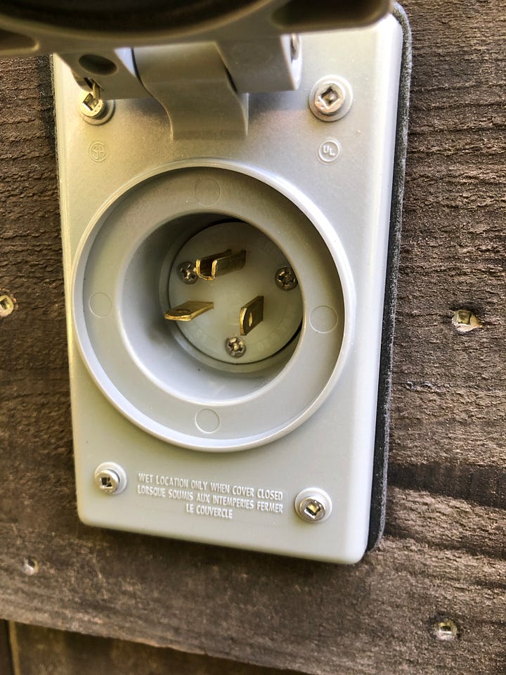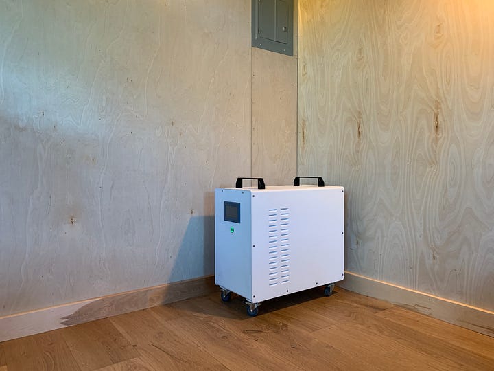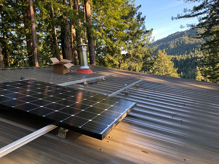 In our old cabin we ran solar power and standard household electrical wiring. I created a system of plugs and a custom cable so that—depending on how they were configured—we could plug the entire cabin into our generator (like shore power for a boat or RV), or the generator could charge our solar battery, or we could just rely on only the solar. That solar battery was a stand-alone unit with a built-in inverter. Those devices are a lot more common now, but at the time we had to order it from China through a shady middleman and pick it up at the Oakland docks after it came off the boat. I realize this sounds like 1918, but it was 2018.