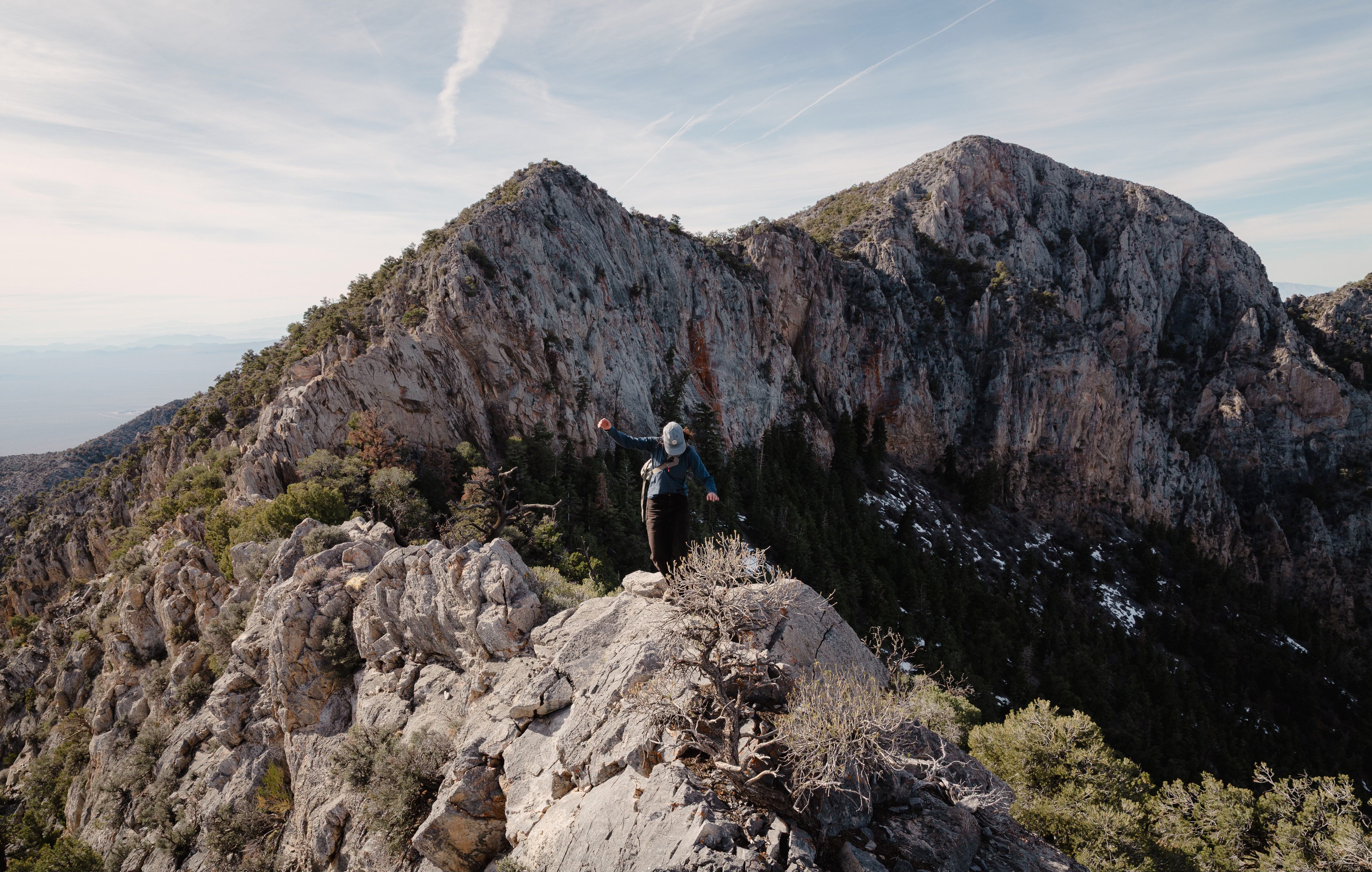 That afternoon we traced a rowdy road over the range and camped just beyond the pass. In the morning we set out toward our only real goal on the trip—summiting Clark Mountain. It’s not terribly tall as far as mountains go. But it’s the highest in the Mojave and has a class 3 scramble near the peak that required a backpack full of rope. It’s off-trail, and squirrely and steep enough that it took us five hours to complete just 2.8 miles.