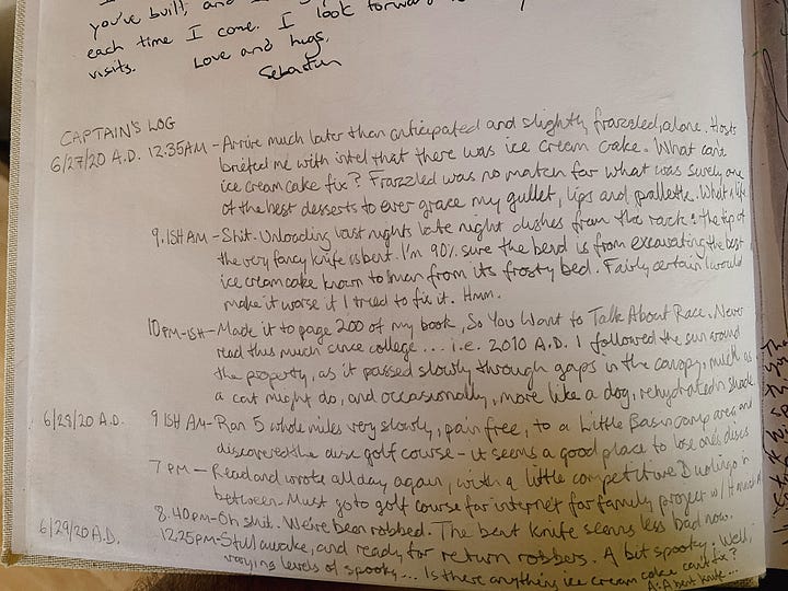 Our appreciation for logbooks runs deep. They feel adventure-y. Nautical. Scientific, yet nearly treasure map-adjacent. Totems to a pre-digital era when records didn’t risk deletion from a power surge. There’s something about hand-written notes1 and the yesteryear necessity of recording happenings and chronological observations for the next visitor to one’s post. Logbooks harken to fire-watch lookouts and ranger stations and lighthouses—remote outposts where communication was stowed for whomever next found it, then dusted off and examined as a sort of antiquity. They’re just… so fucking romantic.