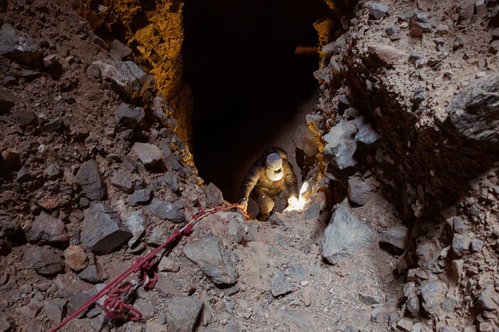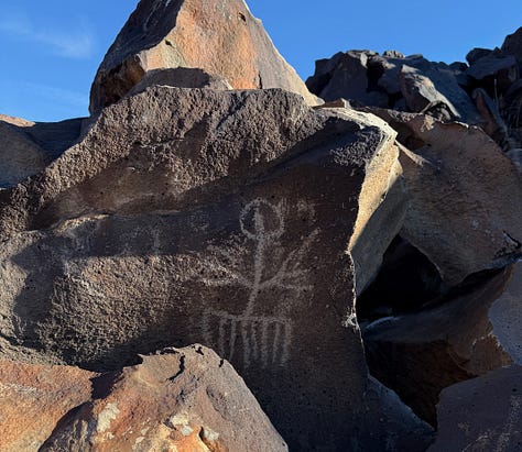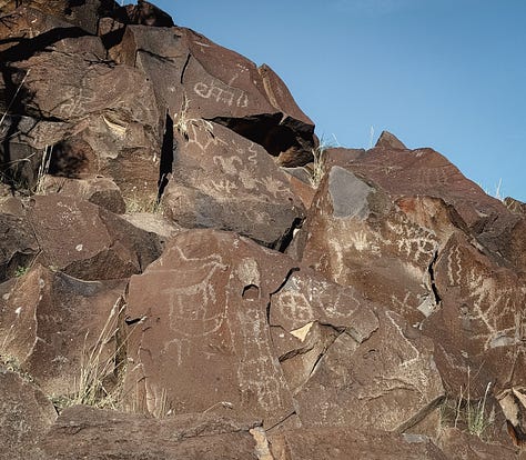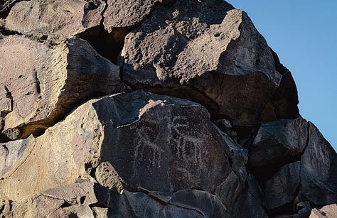 The chasm we found was about twenty feet deep, a hundred yards long, and held 900 petroglyphs. Squiggles and maps and snakes and late-period bighorn sheep and what I can only assume are depictions of alien visitors. These were messages and notes and sketches, beaten into the rock, passed between people who visited the same spot, and shared the same experience, for millennia. Logged in posterity, for however many thousands of years more.