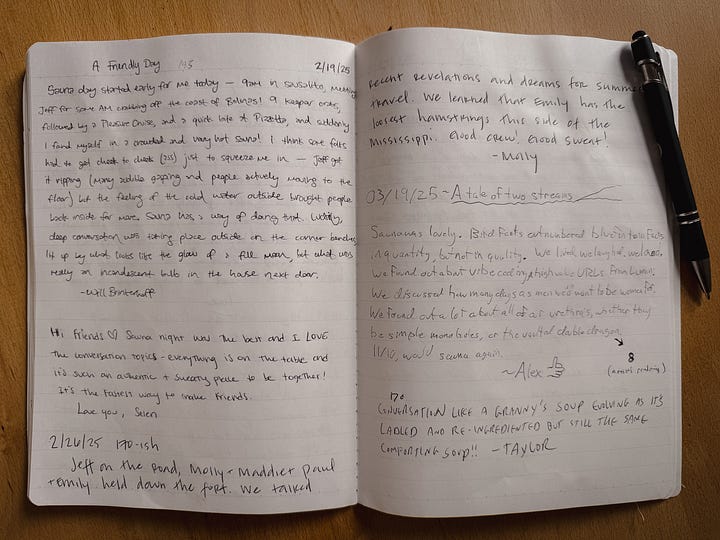 There’s a logbook in the new cabin. And Zach’s kids started a fresh one alongside it—a “Kid’s Draw Log.” We also keep a sauna log. It’s customary for new attendees to fill it out, but otherwise there’s no real system and it’s pretty freeform.