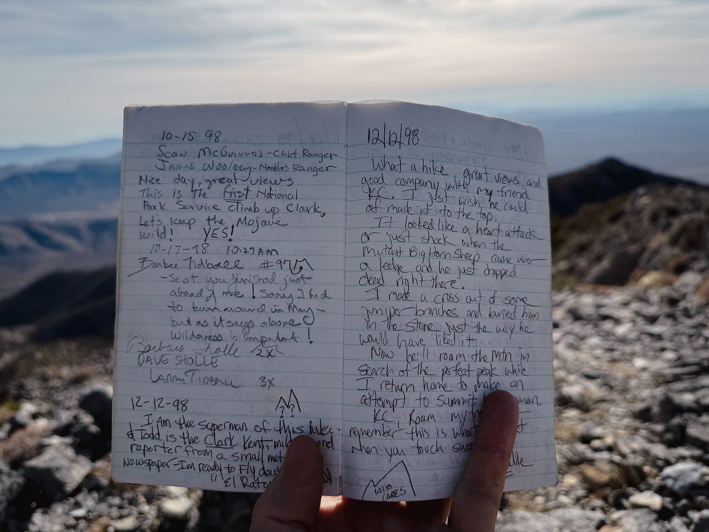 At the summit we found a logbook. Placed there in 1995 by a Sierra Club chapter. This one we signed. It wasn’t much to make it to the hot springs—but this mountain top only sees about one visitor a month. Seemed worth saying hi.